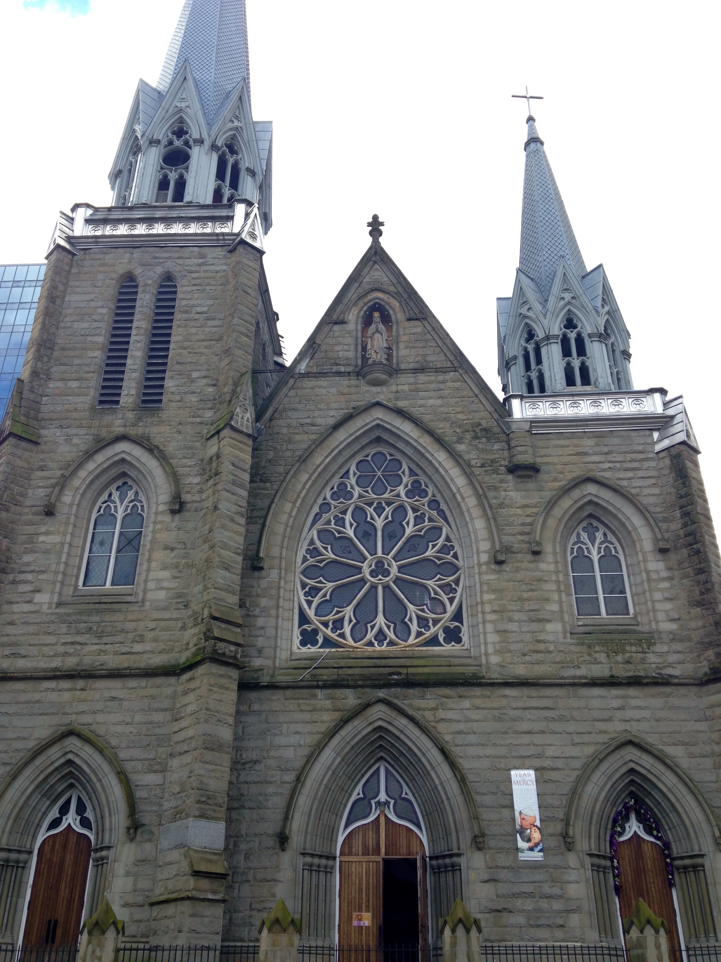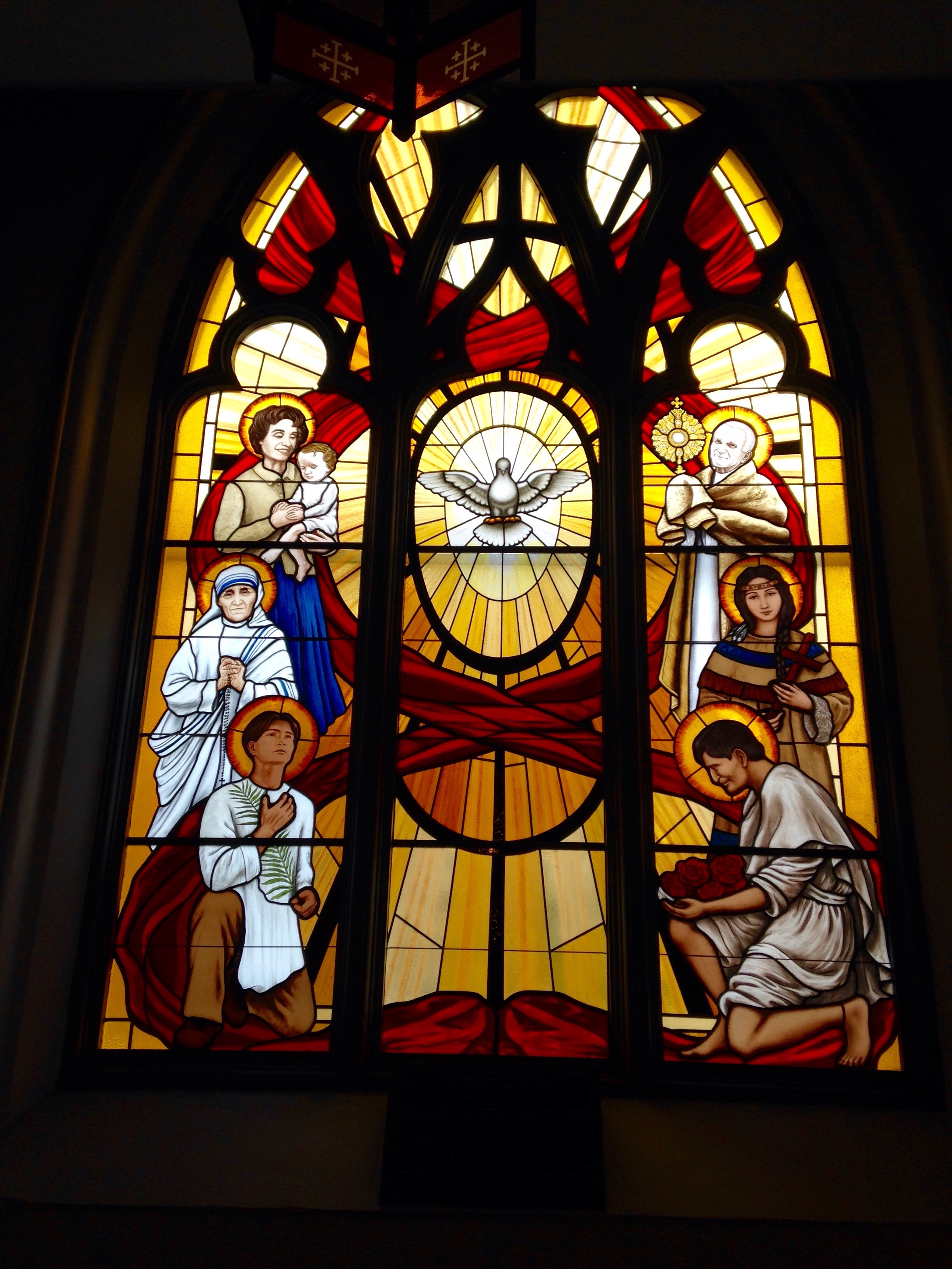 Holy Rosary Roman Catholic Church, 646 Richards Street (corner of Richards and Dunsmuir Streets), Vancouver, BC, Canada. Photo by Rebecca Anderson.There are many heritage buildings near the office where I work, as well as many gorgeous cathedrals, parks and gardens. A quick break from work to spend a moment admiring some stunning architecture, majestic trees and beautifully landscaped gardens, or the hushed interior of a church sanctuary. The Holy Rosary church is about one block from my office and I like to steal a moment of calm and peace once in awhile. The beauty of the stained glass windows there can lift me out of a work-a-day funk and restore my equilibrium, letting me escape into the stories so artfully told and to be transported by light-infused colours to a favourite daydream. There are 21 stained glass windows here, and the newest one, “The Holy Spirit Window”, depicts six saints: Mother Teresa and Pope St. John Paul II (because they had visited Vancouver), Sts. Gianna Beretta Molla, Kateri Tekakwitha, Juan Diego, and Pedro Calungsod. The dove at the centre represents the Holy Spirit.