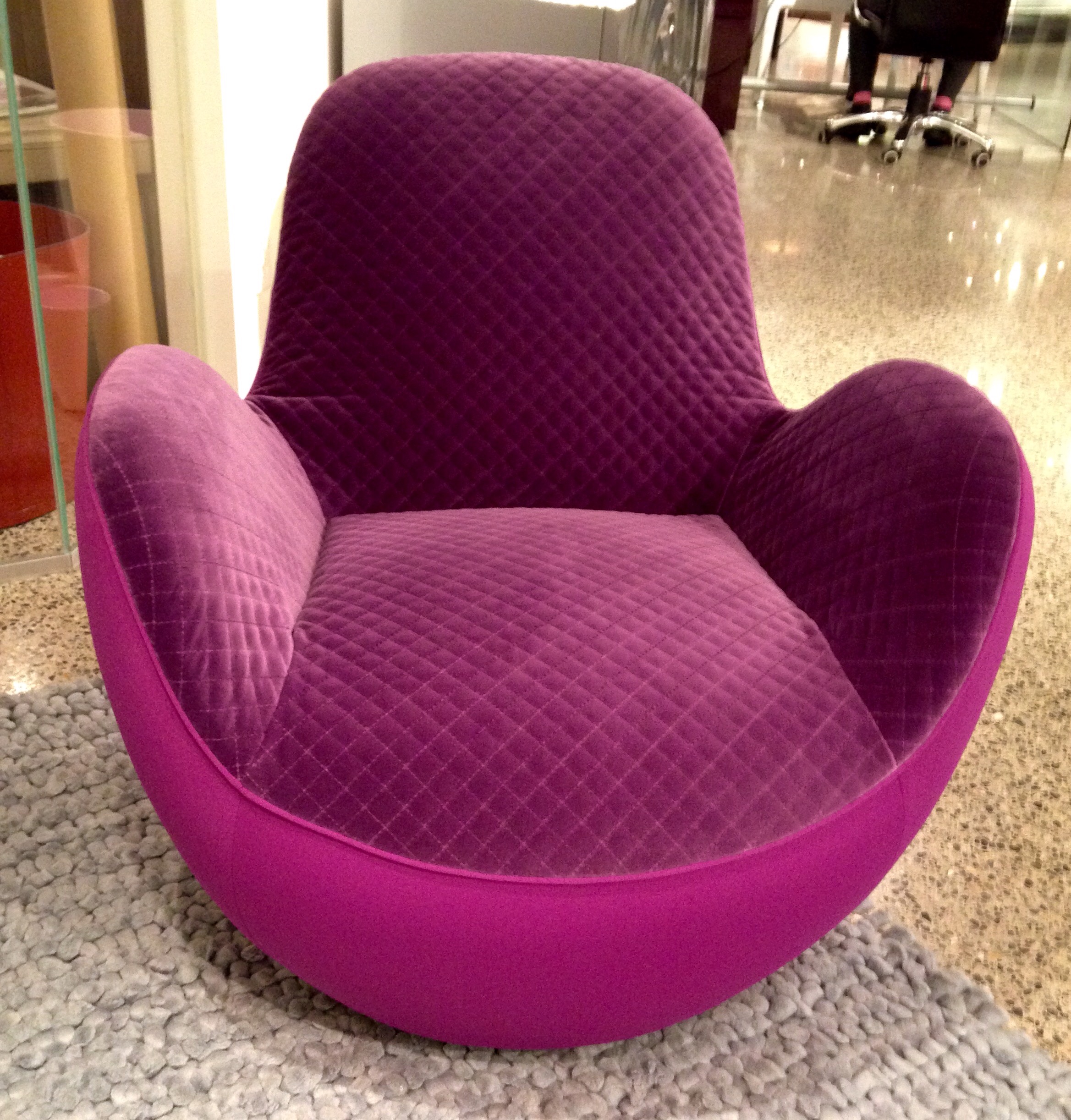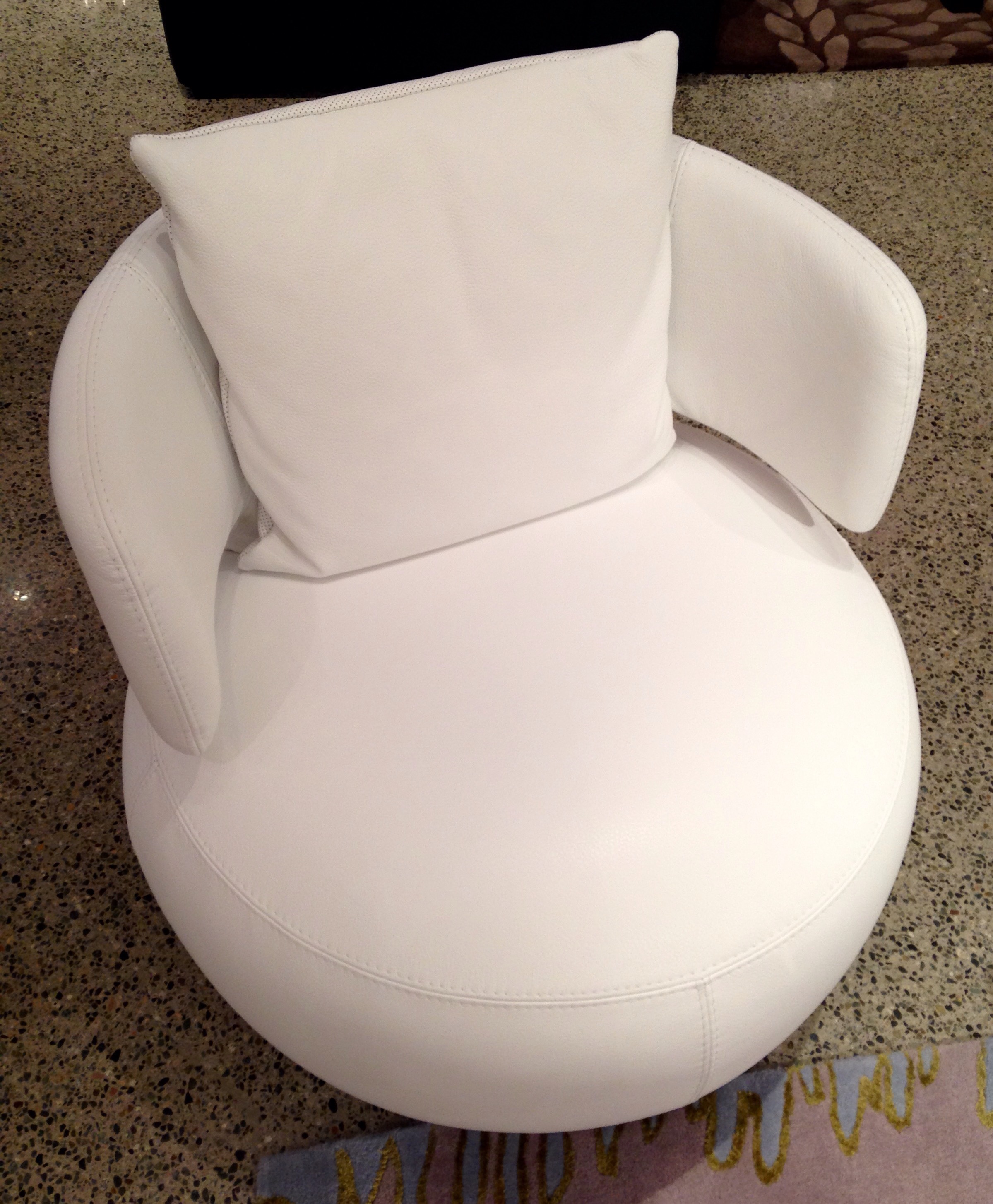 As I regenerate in the comfort of my home, I get ready to fly from the nest back out into the world.  My goal is to face the outside world with renewed energy and with my work-life balance restored.  With a holiday, a weekend, a time of renewal at home, my mind makes a U-turn, looking back in time towards a younger version of myself, characterized by playfulness.  I find myself drawn to adventurous pursuits that would have seemed impossibly exhausting a short while before.  Laughter bubbles up more readily.  Creative ideas flow more freely.  People seem kinder and have new appeal.  During a rare day off last week, I discovered an inspiring store of playful and juicy ideas for making my home atmosphere more lively and colourful.  Only three blocks  from my office is Roche Bobois, located at 716 West Hastings Street, Vancouver, BC.  Roche Bobois is a Parisian shop of wonders whose showroom included a chair with a back decorated with glorious goose feathers; a violet-coloured, aviator-inspired chair; and beautiful, modern white leather swivel chairs that cradled me in comfort.