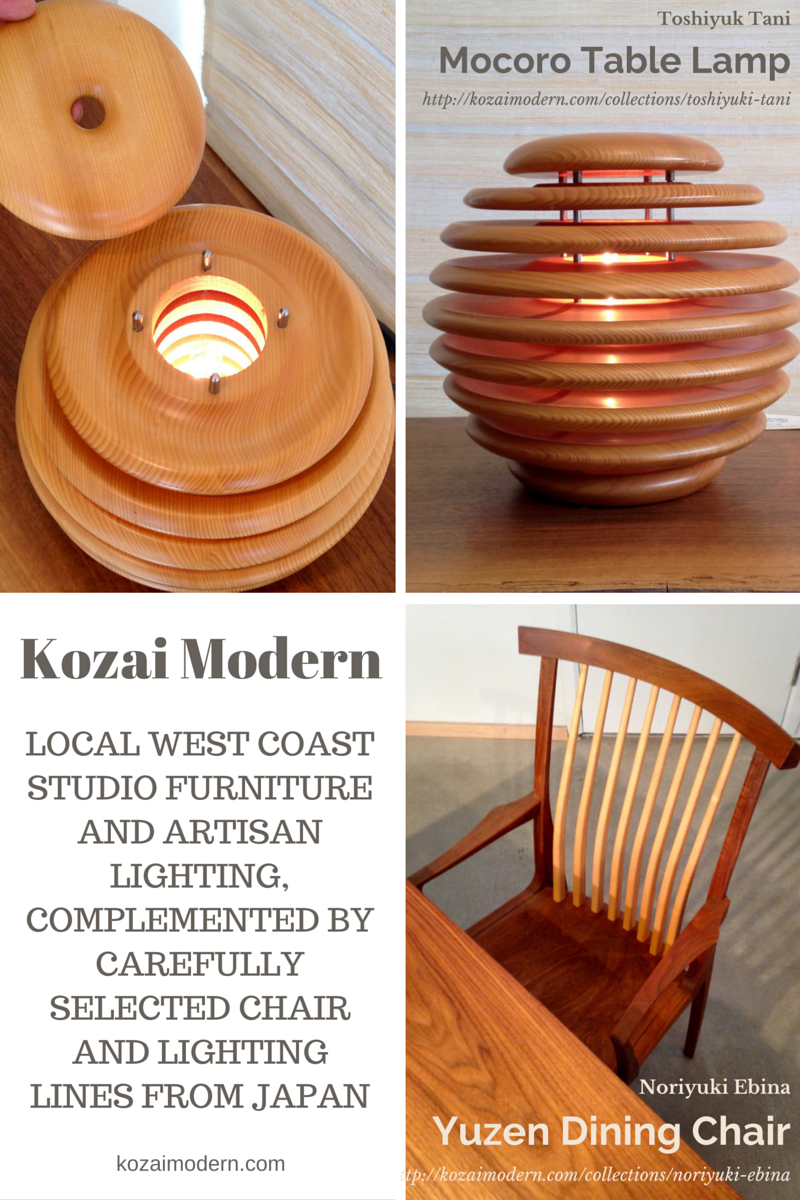 Kino Guérin works from Melbourne, Quebec, but I went looking for a store in Vancouver, BC, that might offer his products for sale.  I found only one store, Kozai Modern, which sells his “S” Shelf.  Although I wished I could find more pieces by Kino Guérin, I was intrigued by the stunning woodwork of some of the other artists that were on display in the store, located at 1515 West 6th Avenue, Vancouver, B.C.  I enjoyed chatting with the owner, who was warm and friendly, as well as informative regarding  the designers, about whom he is personally knowledgeable as he travels to select items for the Vancouver showroom.  I enjoyed his story about the Mocoro table lamp designed by Toshiyuk Tani, who chose Japanese hemlock wood for this piece.  There is some connection between the region where the wood is acquired for this lamp and the ancient Japanese tradition of wooden button-making, a dying art form with few surviving artisans who possess knowledge of the skill.  The shop owner at Kozai Modern showed me how the construction of the Mocoro table lamp resembles a stack of wooden buttons, and we agreed it could have been appropriately named the “Button Lamp”.  I also was drawn to the Yuzen Dining Chairs designed by Noriyuki Ebina.  The selection of wooden tables, chairs and wooden lighting fixtures is exquisite, and any of the designers’ pieces featured at Kozai Modern would be a treasure to enjoy in one’s home.